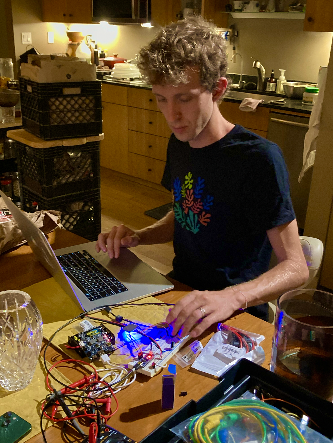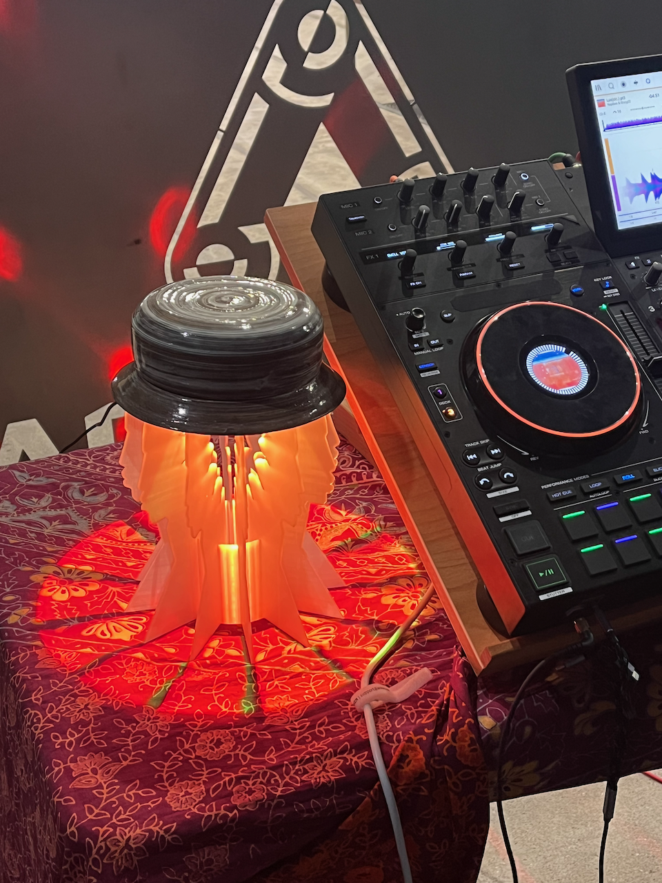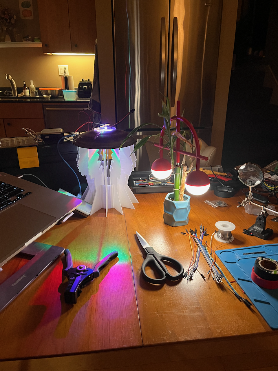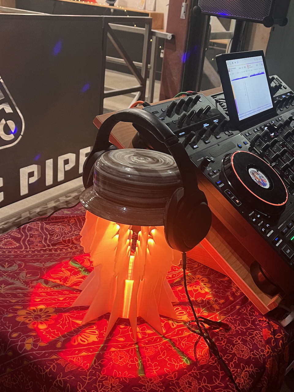 There are a lot of photos here and some documentation for the esoteric button programming and design. This was a collaboration: My friend Novel had the vision and threw the bucket hat out of clay, a friend of theirs helped with the recycled bottle 3D print, and I fine-tuned the LED color and button design.