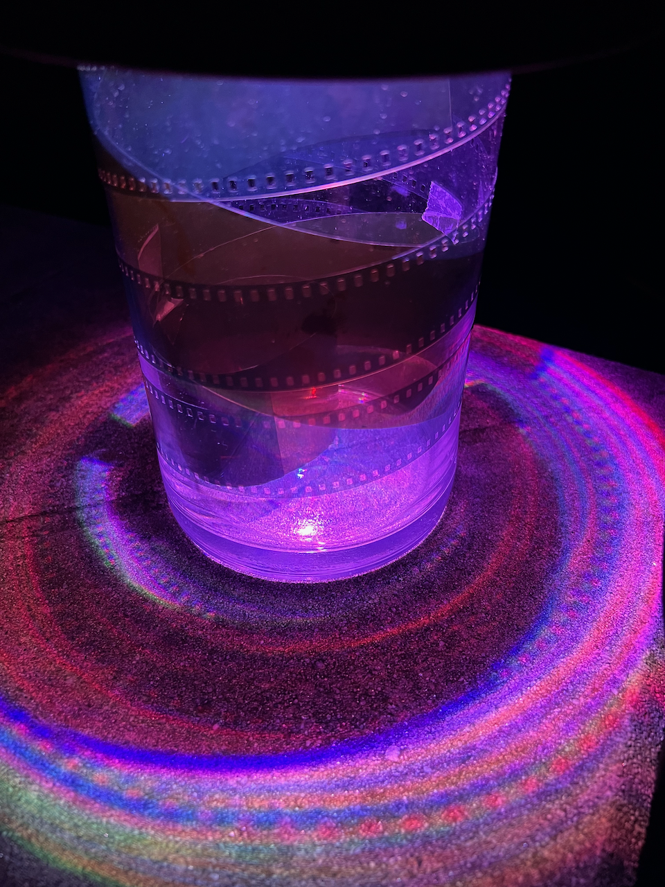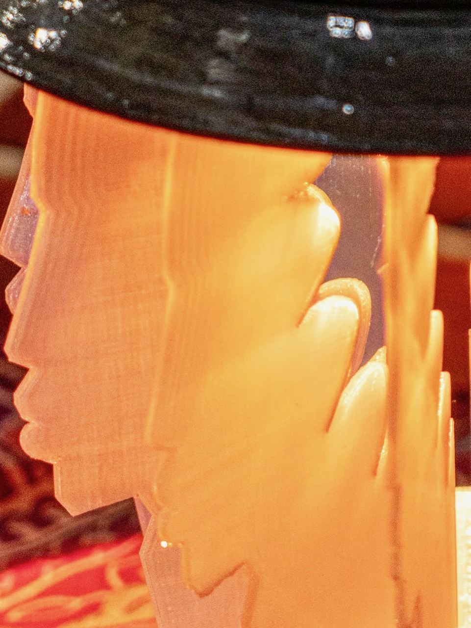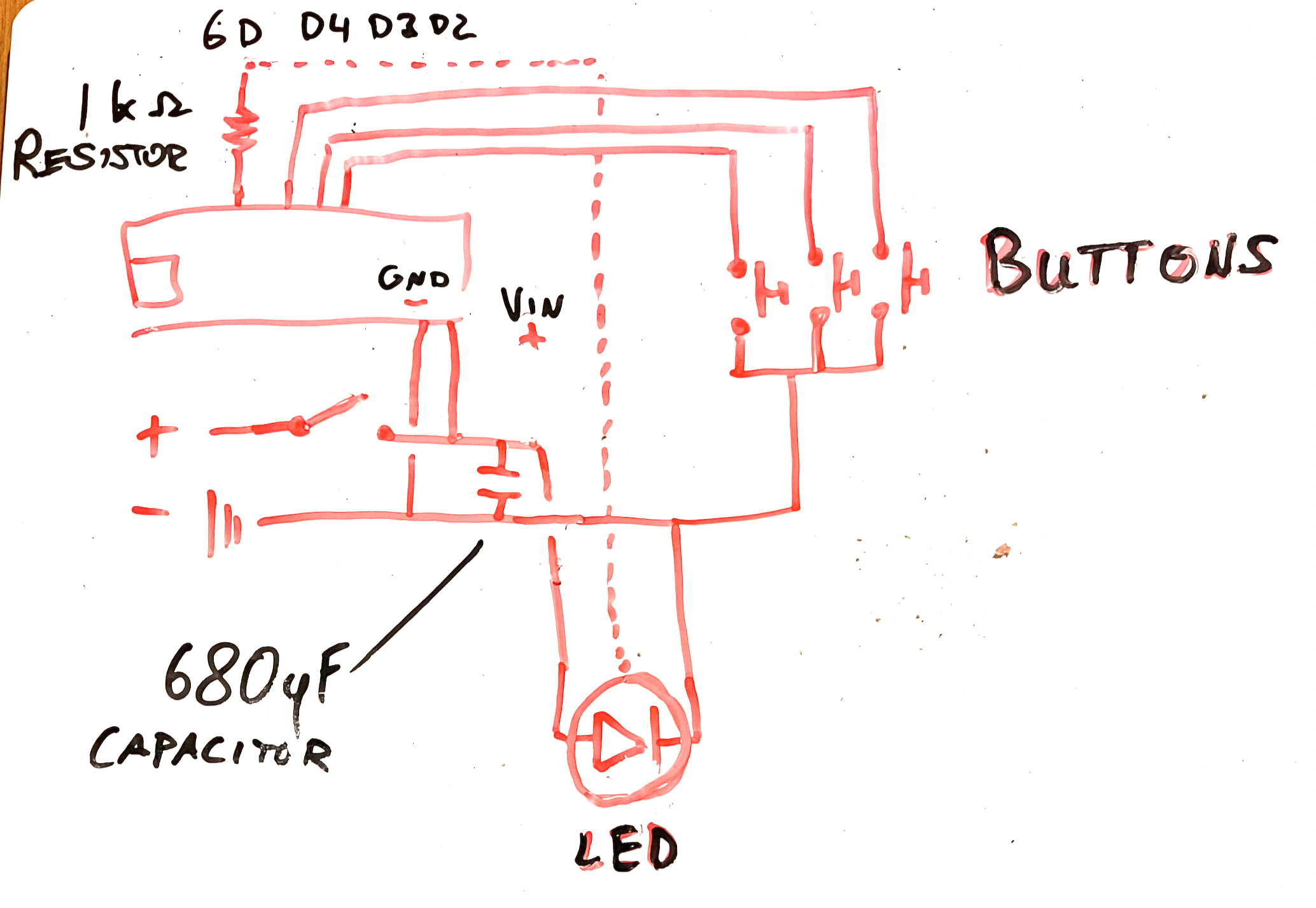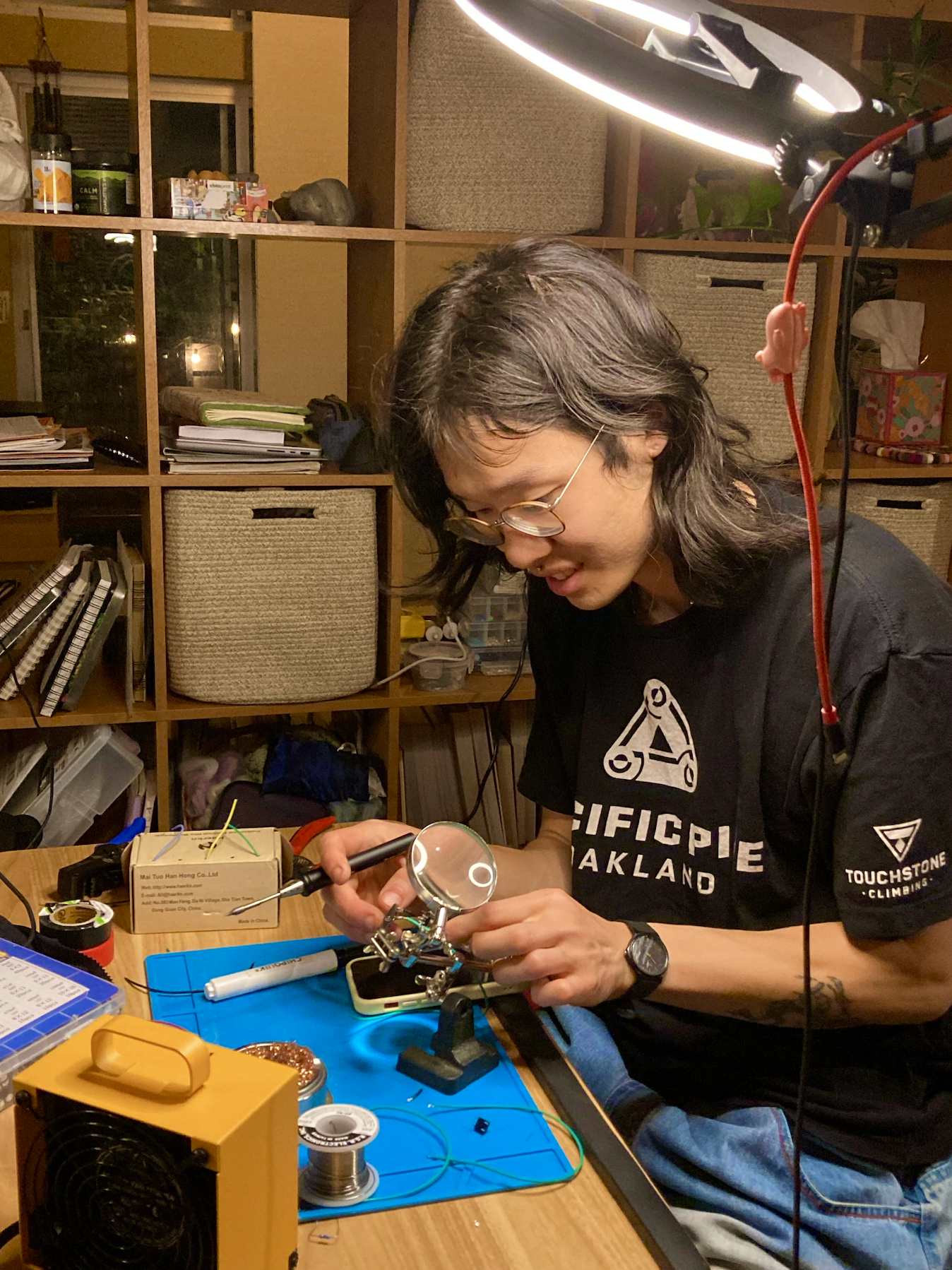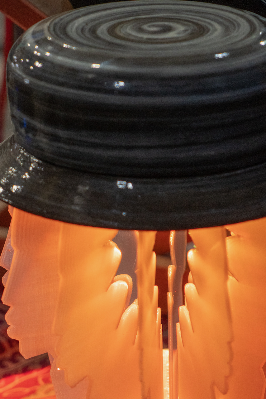 There are a lot of photos here and some documentation for the esoteric button programming and design. This was a collaboration: My friend Novel had the vision and threw the bucket hat out of clay, a friend of theirs helped with the recycled bottle 3D print, and I fine-tuned the LED color and button design.