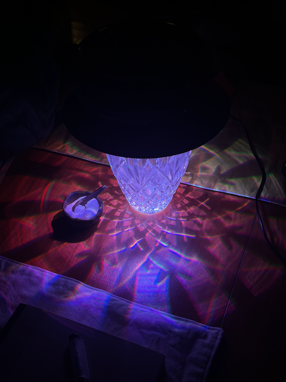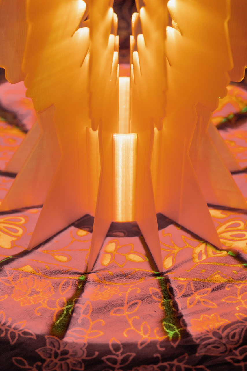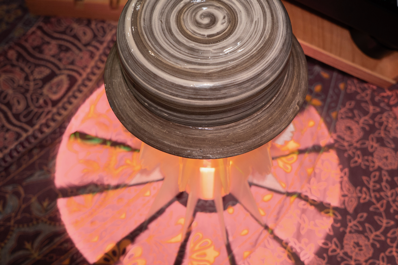 A lamp made with clay, recycled plastic bottles, and an esoteric button design